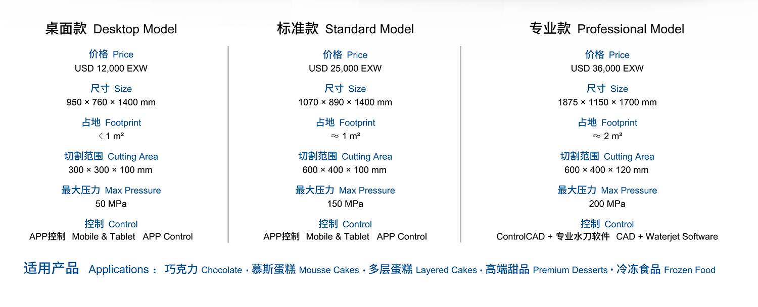 Specific designed for food cutting, including fresh/frozen cakes, chocolates, biscuits, pork, beef, fish etc, for customized shapes, splicing graphics and creative desserts etc..