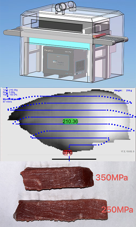In view of the particularity of food processing, we use ultra-high pressure pure water jet cutting technology, combined with visual recognition, conveyor belt loading and unloading and high-speed gantry three-axis system to build a full-process intelligent cutting solution: