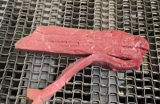 As the food processing industry is transforming towards automation and refinement, food processing companies are facing bottlenecks in the traditional cutting process during the production of beef jerky: manual cutting capacity is limited, and the cutting path of oscillating knife can not be programmed intelligently. , resulting in high cutting losses (about 15%-20%) and different size of finished products. The company urgently needs a high-precision cutting solution suitable for slightly frozen beef to achieve an upgrade from “manual extensive cutting” to “intelligent precision processing” to meet the annual production capacity requirements of thousands of tons of beef jerky, while reducing material losses and labor costs.
